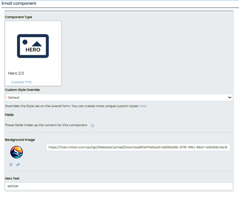 A Custom Style Override dropdown is available, allowing users to apply a unique style that differs from the overall form or template. This is particularly useful for tailoring the hero section to match campaign branding or seasonal themes.