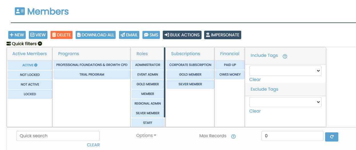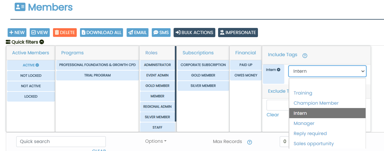 Adding tags to members is essential for organizing and segmenting your database effectively. Tags allow you to quickly identify specific groups and take targeted actions. Once members are tagged, you can either manage them individually or perform bulk actions—such as sending emails, SMS, downloading data, impersonating users, or applying edits—using the toolbar at the top of the dashboard. This makes communication faster, updates more efficient, and ensures the right members receive the right attention at the right time.