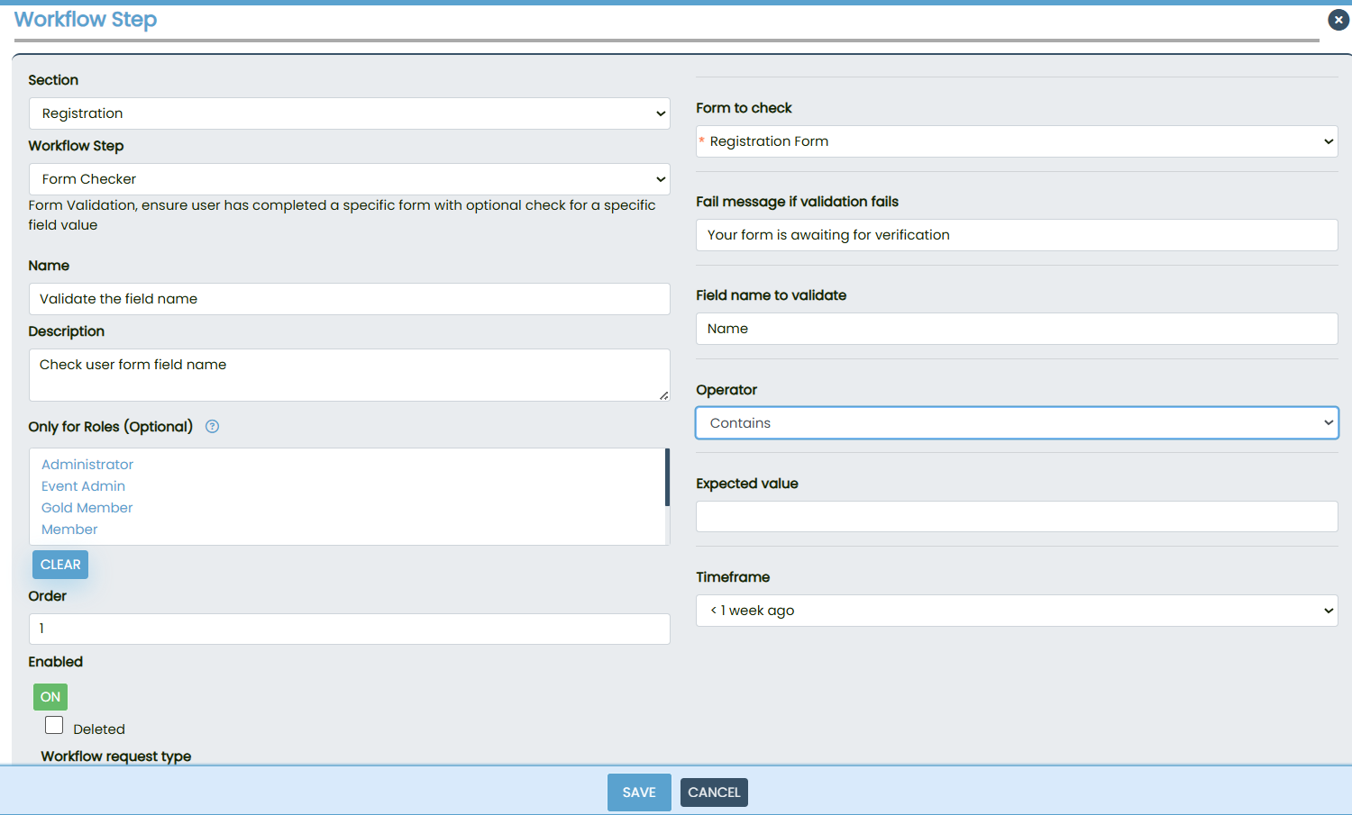 The workflow step is configured as a Form Checker. Administrators select the form that must be validated, for example the Registration Form, and may also specify a field name, an operator such as “equals” or “contains”, and an expected value. A failure message is defined so that users are clearly informed when validation has not been met. The step can be restricted to certain user roles if required, and it is placed in the correct order within the workflow sequence.
