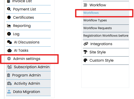 To begin, log in to the Mition admin dashboard. From the left-hand menu, scroll down and click on Admin Settings. In the submenu that appears, select Workflows. This section allows you to create, edit, and manage workflows