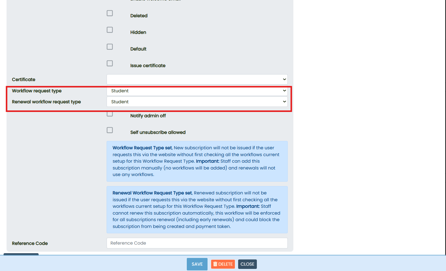 Set the Renewal Workflow Request Type to the same or a different one, depending on your needs. This ensures that users must complete the workflow before their subscription or renewal is processed.