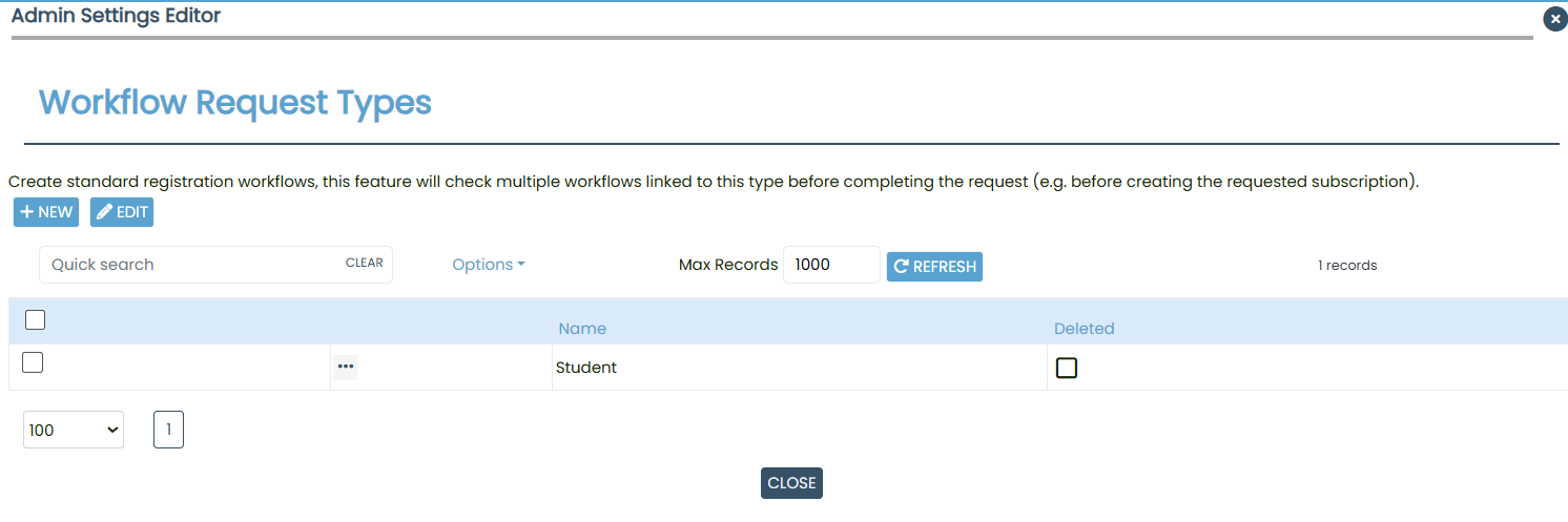 Navigate to Workflow Request Types under Admin Settings. Click + NEW to create a new type. Give it a clear name, such as “User Verification” or “Supplier Onboarding.” Add a description like: “Complete your registration. See tasks still required on your dashboard.” Save the request type.
